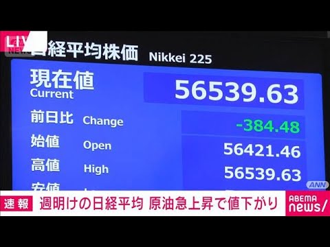 原油の先物価格が急上昇したことを受けて、週明けの日経平均株価は取引開始とともに値下がりしています。