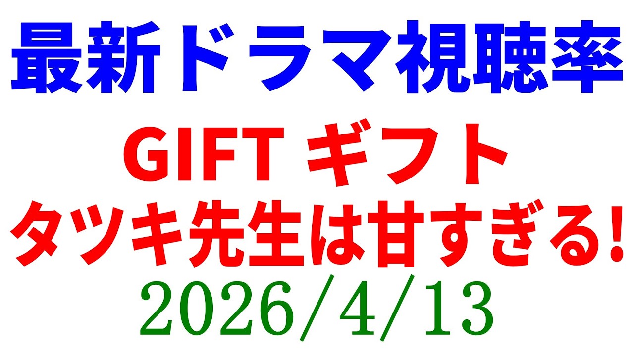 GIFT 視聴率低いか!視聴率速報☆2026年4月13日 ### ☆Amazon欲しいものリスト https://www.amazon.jp/hz/wishlist/ls/3MTQPTNTTWFUH?ref_=wl_share <ツイッター> https://twitter.com/KkReview このチャンネルのメンバーになって特典にアクセスしてください: https://www.youtube.com/channel/UC8I3iWxXV7Zqa5PpAeAlcFA/join dramaTVドラマテレビドラマドラマドラマ視聴率レビュー感想考察視聴率