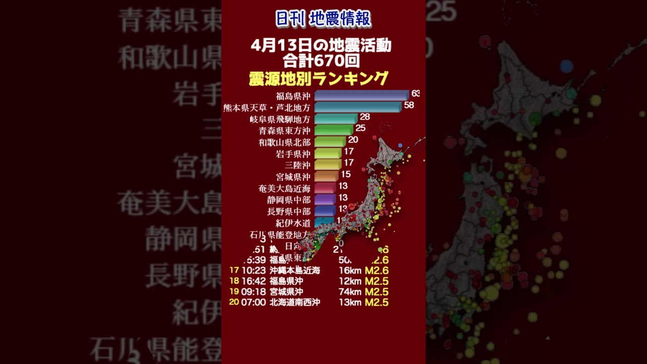 【地震情報】4月13日の地震活動 2026年4月13日の地震活動です。 気象庁より発表されます無感地震のデータを震源地ごとに集計しております。 #地震情報 #無感地震 #気象庁 4月13日NEWS地震情報気象庁無感地震震源情報