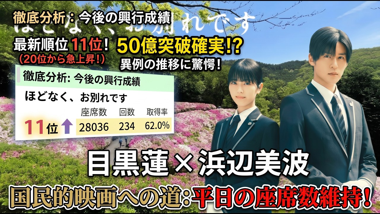 Snow Man目黒蓮と浜辺美波が贈る感動の映画『ほどなく、お別れです』が興行収入50億円突破へ一直線!最新順位と異例の推移に驚愕の声が続出!平日の座席数をしっかり維持し続け、国民的映画への道を駆け上がる本作の未来を徹底的に分析します。必見の興行データ満載でお届け!