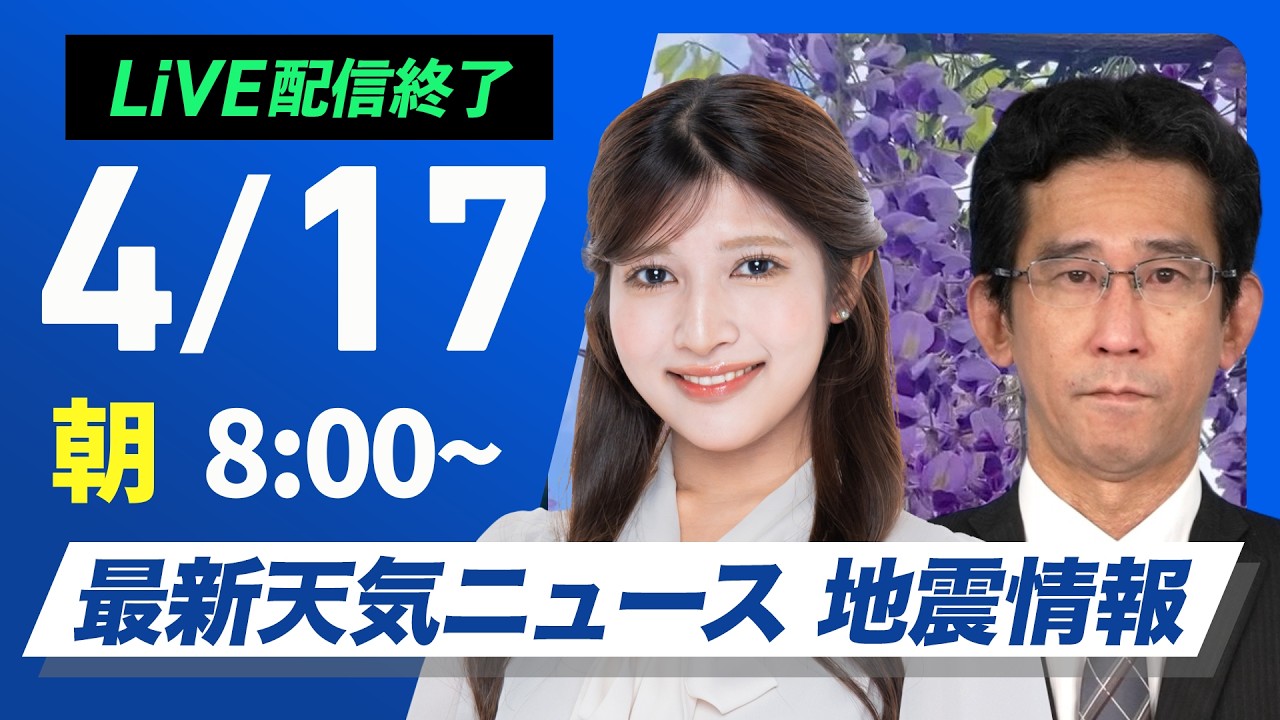 【ライブ配信終了】最新天気ニュース・地震情報 2026年4月17日(金) /西から雲増加も晴れる所が多い 日本海側で気温上昇〈ウェザーニュースLiVEサンシャイン・岡本結子リサ/山口剛央〉