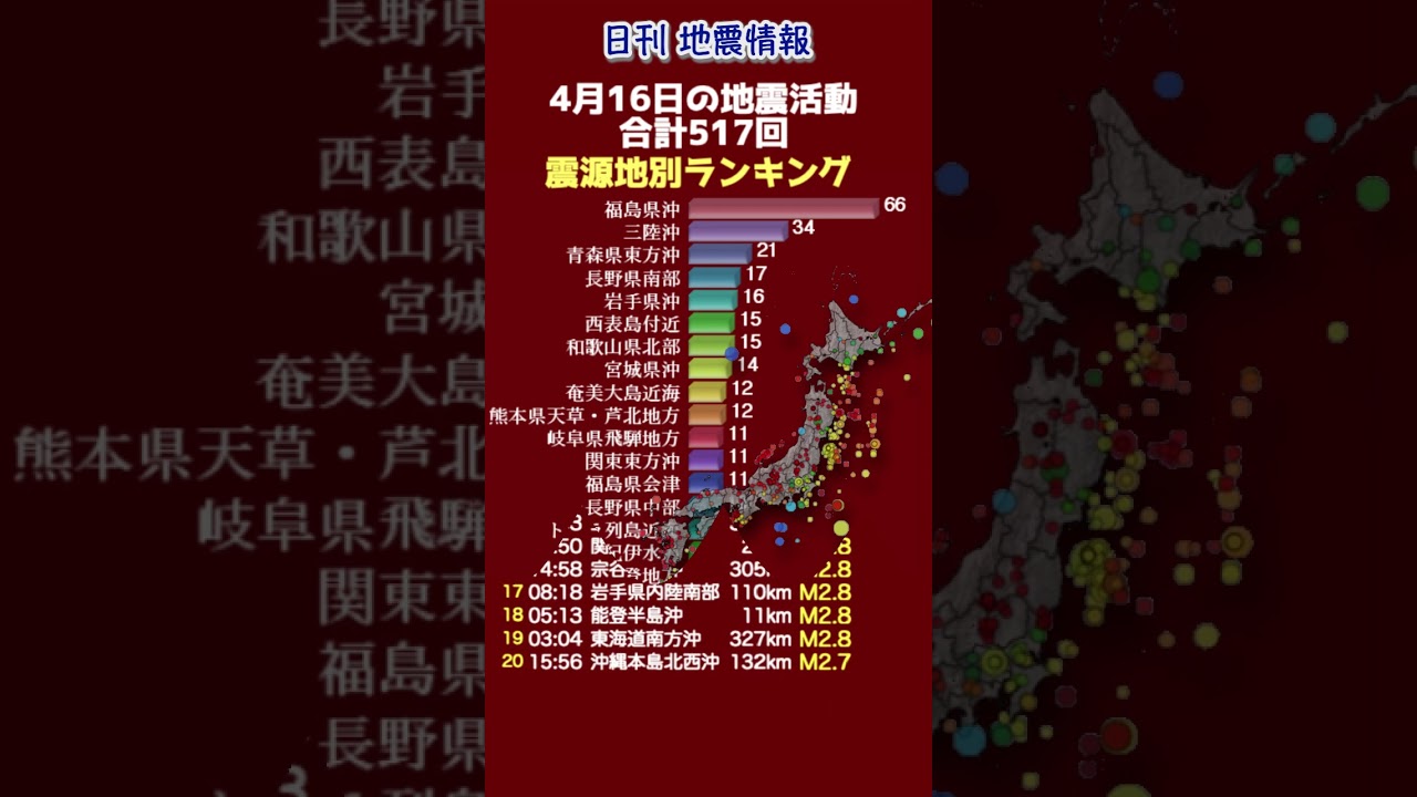 【地震情報】4月16日の地震活動 2026年4月16日の地震活動です。 気象庁より発表されます無感地震のデータを震源地ごとに集計しております。 #地震情報 #無感地震 #気象庁 4月16日NEWS地震情報気象庁無感地震震源情報