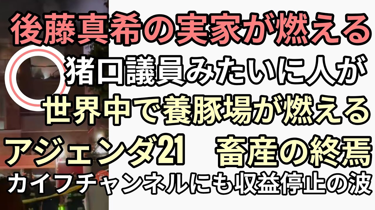 後藤真希の実家が燃える 猪口議員みたいに人影 世界中で養豚場が燃える2030年ミッションゴール畜産の終焉 カイフチャンネルにも収益停止の波