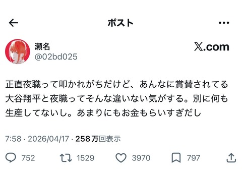 1:それでも動く名無し:2026/04/20(月) 10:49:57.62 ID:P5mT0+fr02:それでも動く名無し:2026/04/20(月) 10:51:44.10 ID:4h83CizE0たし4:それでも動く名無し:2026/04/20(月) 10:52:28.98 ID:Rfs9Is9S0娯楽だしな5:それでも動く名無し:2026/04/20(月) 10:53:32.73 ID:BxFcaJjr0金額の大小はあるけど正しいわな 棒を振るか咥えるかの違いしかない 2ch2chblognews2ch