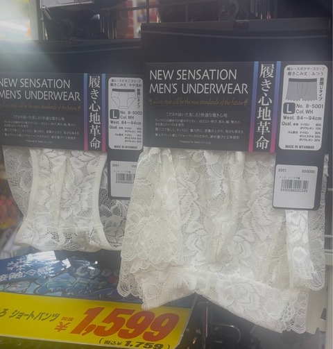 1:それでも動く名無し:2026/04/17(金) 14:54:12.21 ID:5ZApuAhP0しかもそこまで都会じゃなく郊外のドンキ そこまで需要ある品なの? 2:それでも動く名無し:2026/04/17(金) 14:54:34.99 ID:5ZApuAhP0アダルトコーナーじゃなく普通の下着売り場にあるのも怖かった 3:それでも動く名無し:2026/04/17(金) 14:55:39.75 ID:KM9S6QTT0都会では男は皆レースパンティー履いてるぞ 2ch2chblognews2ch