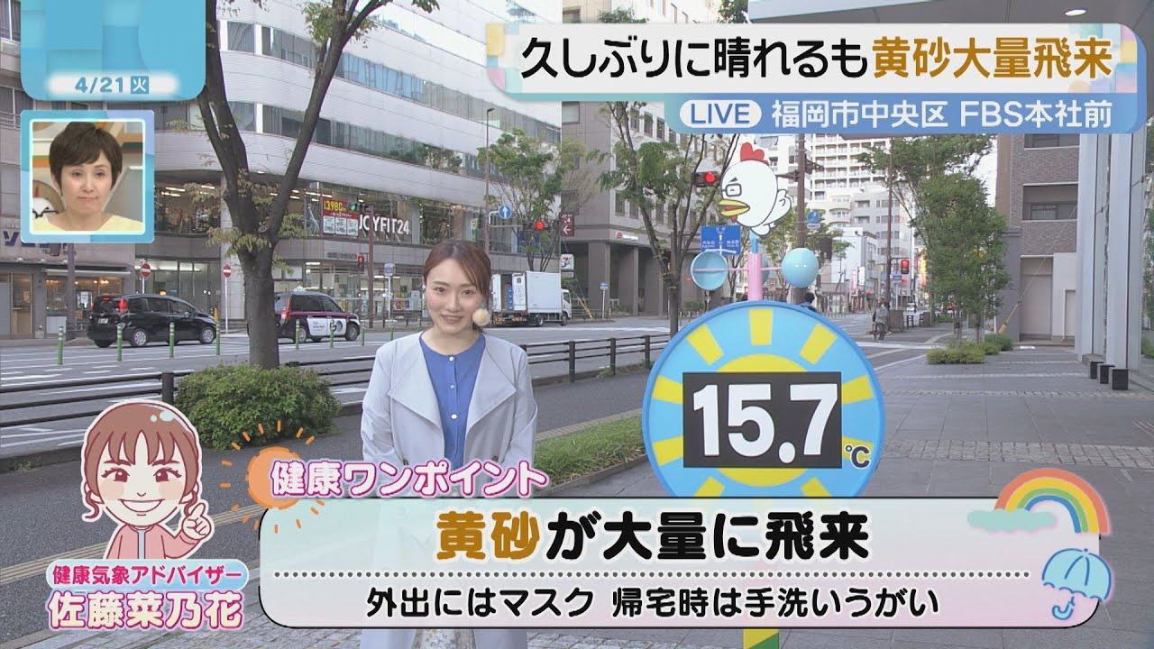 よく晴れて風が強まる21日は、黄砂の飛来に注意が必要です。福岡県や佐賀県には朝から飛来し、午後がピークとなりそうです。外出の際はマスクを着用し、帰宅時は手洗い、うがいをしっかりとするようにしましょう。呼吸器系の疾患のある方は特にご注意ください。
