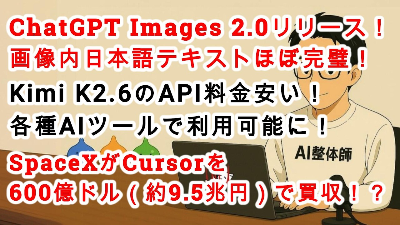 【#AIニュース No.341】ChatGPT Images 2.0が正式リリース!Kimi K2.6のAPI安い!SpaceXがCursorを600億ドル(約9.5兆円)で買収!?