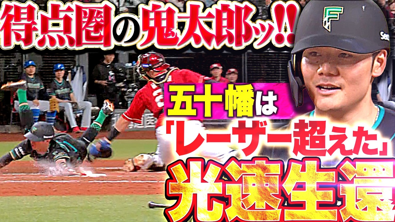 勝ち越しを許し迎えた8回裏の攻撃。インコースの難しいボールに対し、うまく腕をたたんで引っ張った打球がライトへ!! 北海道日本ハム・清宮幸太郎が値千金の同点タイムリー!! 五十幡亮汰もレーザーを超えた光速走塁で魅せた!! 得点圏打率は4割超えと、得点圏の鬼太郎がチームを救った!!