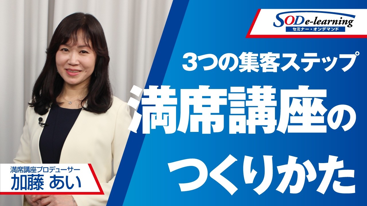 満席講座プロデューサーの加藤あい氏によるセミナー「満席講座のつくりかた」をご紹介します。多くの経営者やビジネスパーソンが抱える「良い企画なのに人が集まらない」という課題解決の第一歩として具体的なテーマ設定や企画構成の基礎を問題提起とともに解説しています。知っていると出来ているの違いに気づき明日からのビジネスに活かせるヒントを見つけてください。