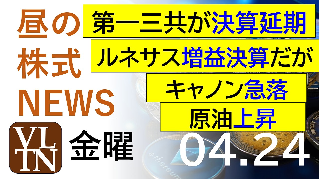 第一三共が決算延期で急落。ルネサス、大幅増益の決算だったが・・・。原油が上昇。キャノンが急落。2026年4月24日(金)~明日上がる株最新の日本株情報。高配当株の株価やデイトレ情報~