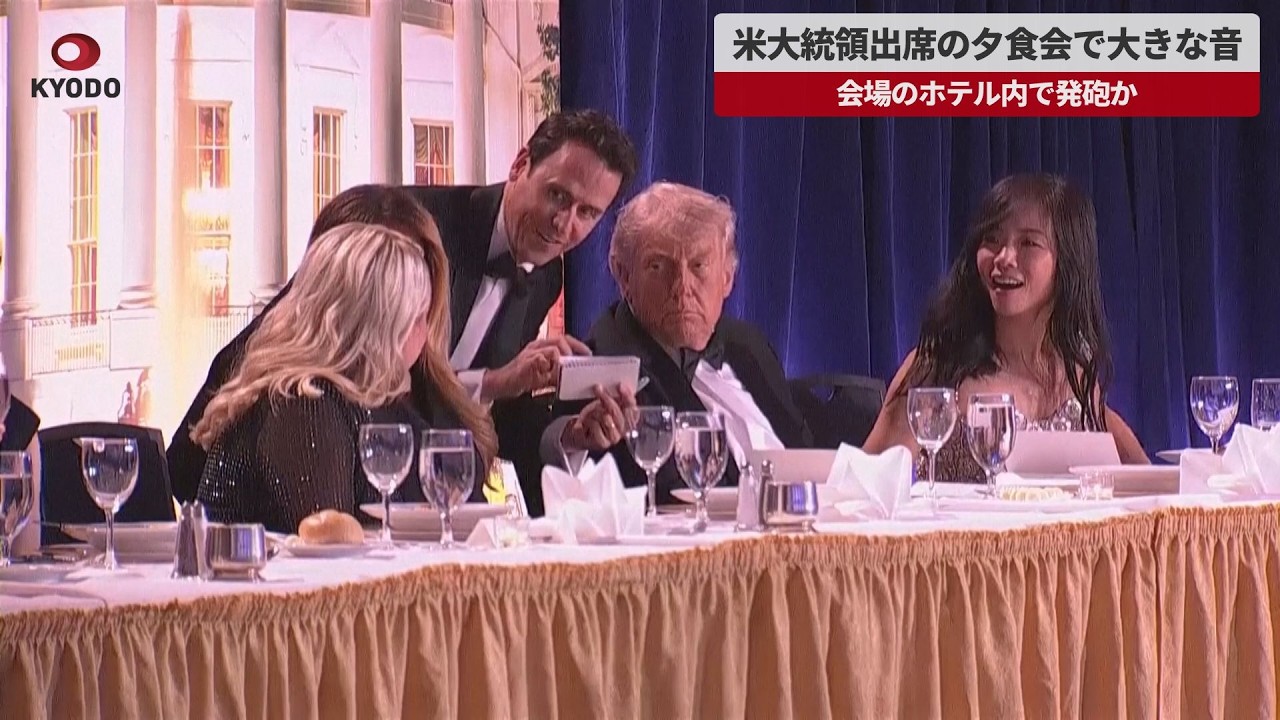 トランプ米大統領が出席したホワイトハウス記者会主催の夕食会の会場で25日夜、大きな音が複数回した。参加者は会場外に出たり、床に伏せたりするなど騒然となった。トランプ米大統領は、ホワイトハウス記者会主催の夕食会会場から退避した。AP通信によると、夕食会会場から退避したトランプ大統領にけがはなく、無事だという。またAP通信は25日、トランプ米大統領が出席していたホワイトハウス記者会主催の夕食会会場のホテル内で発砲があったと報じた。