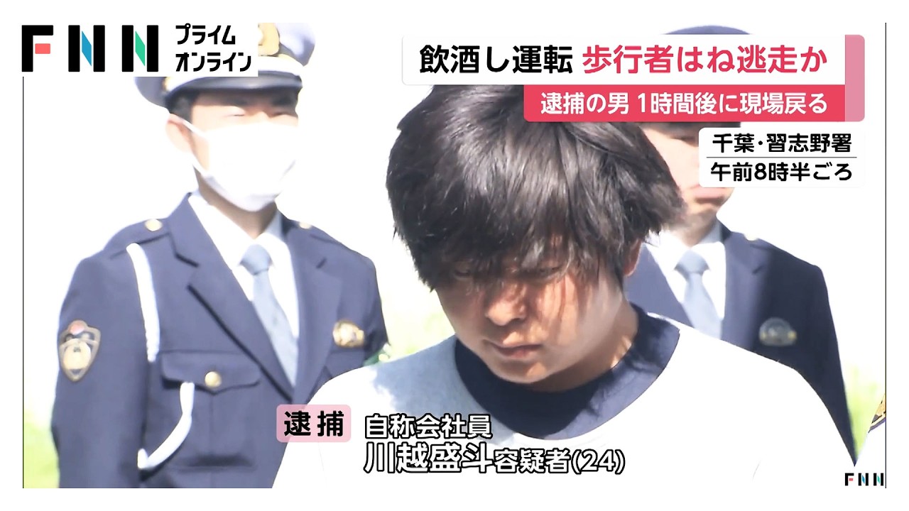 自称会社員の川越盛斗容疑者(24)は25日午前2時過ぎ、習志野市藤崎の県道で酒を飲んだ状態で車を運転したうえ、対向車線にはみ出し走行し、路側帯を歩いていた男性(38)をはね、そのまま逃走した疑いが持たれています。