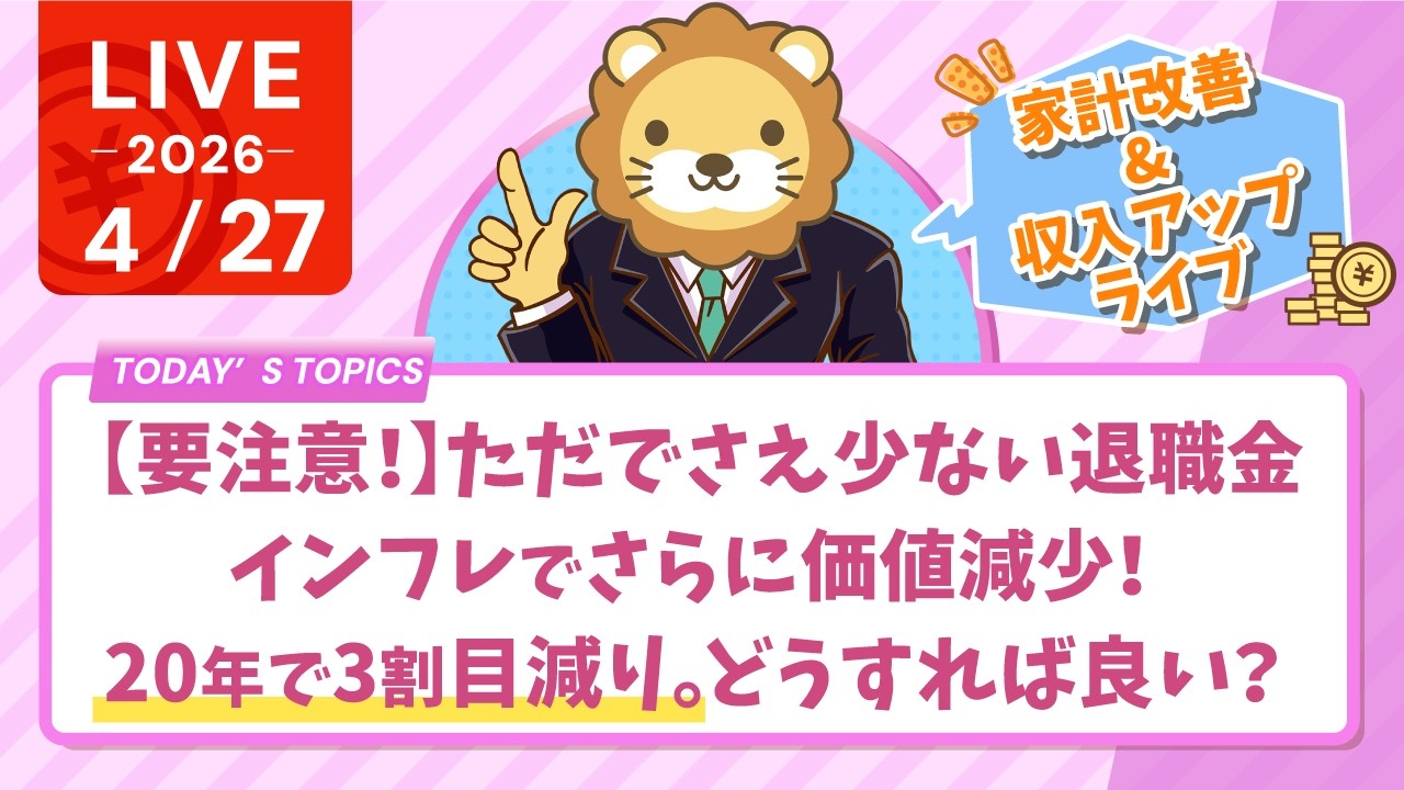 【家計改善/収入アップライブ】 【要注意!】ただでさえ少ない退職金、インフレでさらに価値減少!20年で3割目減り。どうすれば良い?【4月27日8時30分まで】