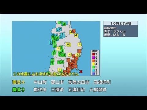 1日午前10時27分頃、宮城県沖を震源とするマグニチュード6.6の地震が発生した。この地震による津波の心配はない。この地震で宮城県で最大震度5強を観測した。