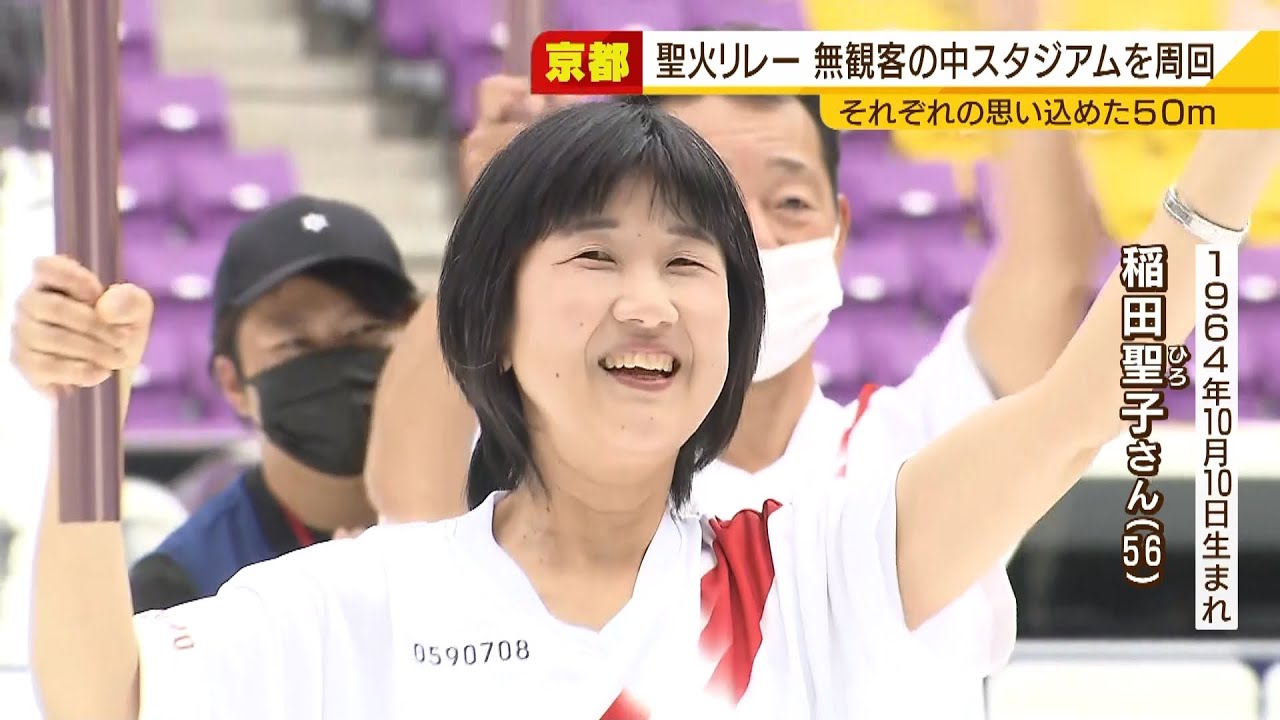 5月26日、京都府での聖火リレー2日目。ランナーらは前日と同じ京都府亀岡市の「府立京都スタジアム」の中を50mずつ走り聖火をつないでいます。
