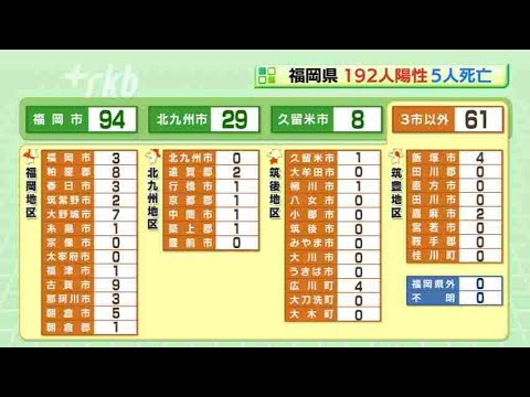 Share Facebook Twitter Pinterest LinkedIn 福岡県は28日、新型コロナの検査で新たに192人の陽性を発表しました。 また、5人が亡くなっています。 続きはこちらから https://rkb.jp/news/002585.html RKBRKBニュース新型ウイルス検査で陽性