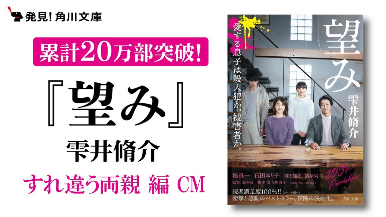 KADOKAWA文芸WEBマガジン「カドブン」で特別試し読み公開中! 愛する息子は殺人犯か、被害者か── 究極のシチュエーションに置かれた家族の交錯する心情を描いた 雫井脩介『望み』(角川文庫)は、累計発行部数20万部を突破しました。 堤真一・石田ゆり子初共演で話題の映画化作品「望み」は10月9日(金)公開です!●『望み』雫井脩介 原作特設サイト ●映画「望み」公式サイト 加藤雅也堤幸彦堤真一奥寺佐渡子岡田健史市毛良枝映画 望み望み松田翔太清原果耶石田ゆり子竜雷太雫井脩介