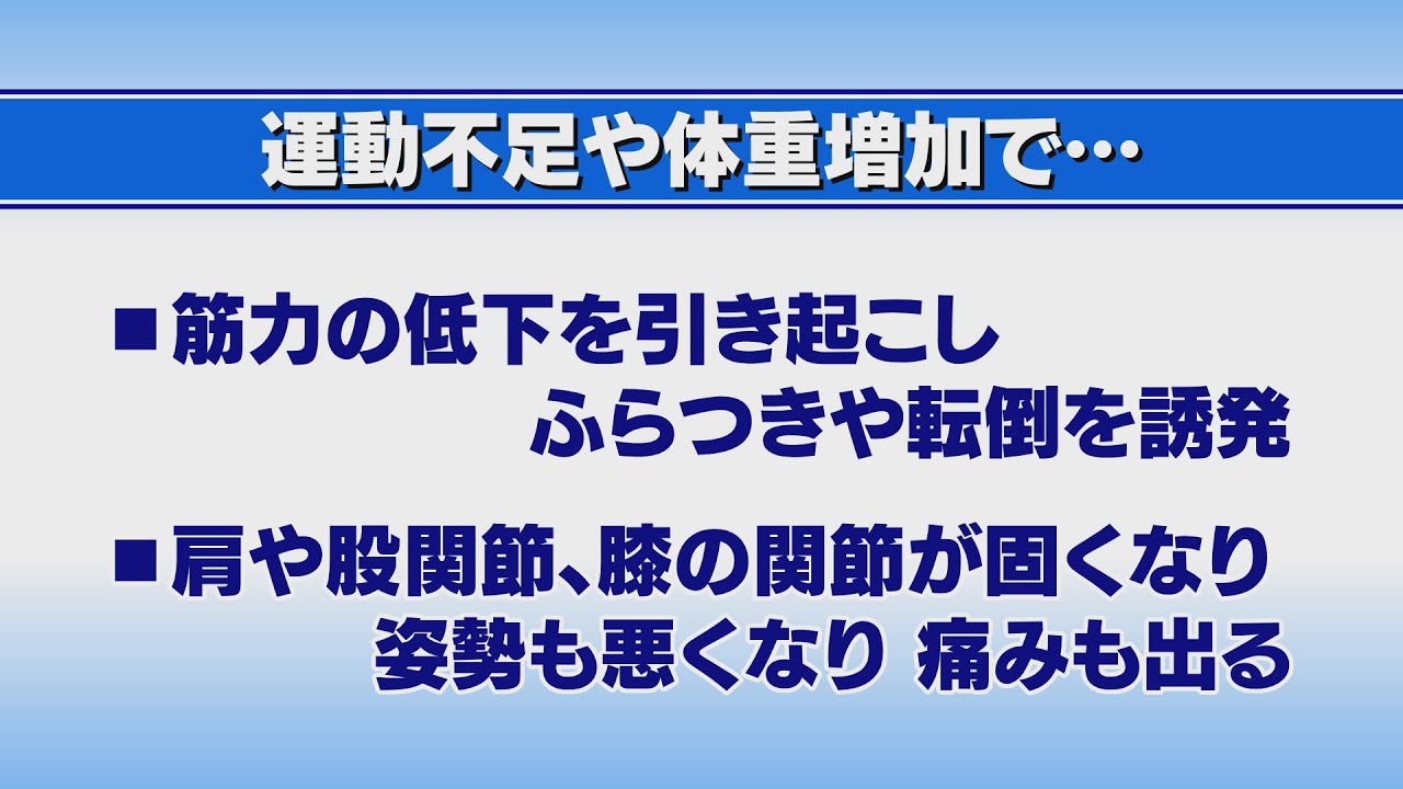 Share Facebook Twitter Pinterest LinkedIn 新型コロナの影響で増えているのが、高齢者の運動不足。出かけるのをやめたり、皆で集まらなくなったりと日常生活が変化した結果、筋力が低下してふらつきや転倒が誘発されたり、関節が固くなって姿勢が悪くなり、痛みが出るなど様々な不調が現れてきている。運動不足解消のため医師が勧める具体的な運動法を紹介する。 コロナ禍