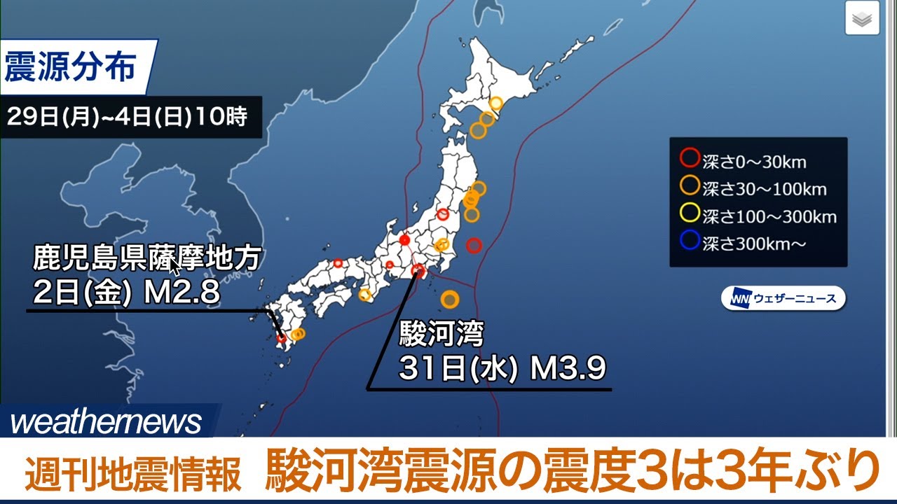 この1週間で国内で観測された地震回数は、前週に比べると少なくなりました。本州の内陸を震源とする地震がやや目立ち、宮城県沖・福島県沖の地震も継続中です。震度3以上の地震は4回発生しました。 2021Casterウェザーニュースキャスターゲリラ豪雨ゲリラ雷雨ニュース乾燥予報停電北日本台風台風情報地震大雨大雪天気天気予報天気痛情報暴風東日本気象気象予報士洗濯減災西日本防災震源情報