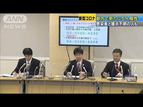 東京都によりますと、新たに感染が確認されたのは60代の男性3人と30代の男性2人です。このうち60代と30代の2人は先月18日に行われたタクシー運転手らの屋形船での新年会に参加していました。さらに60代の男性医師の感染が確認されていますが、この医師は新年会に参加し、15日に感染が判明した女性看護師と複数回食事をともにしていました。また、15日に感染が確認された会社員と同じ研修に参加していた30代の男性会社員や、その他に60代のハイヤーの運転手の感染も確認されました。このハイヤーの運転手については感染者との接点は分かっていません。