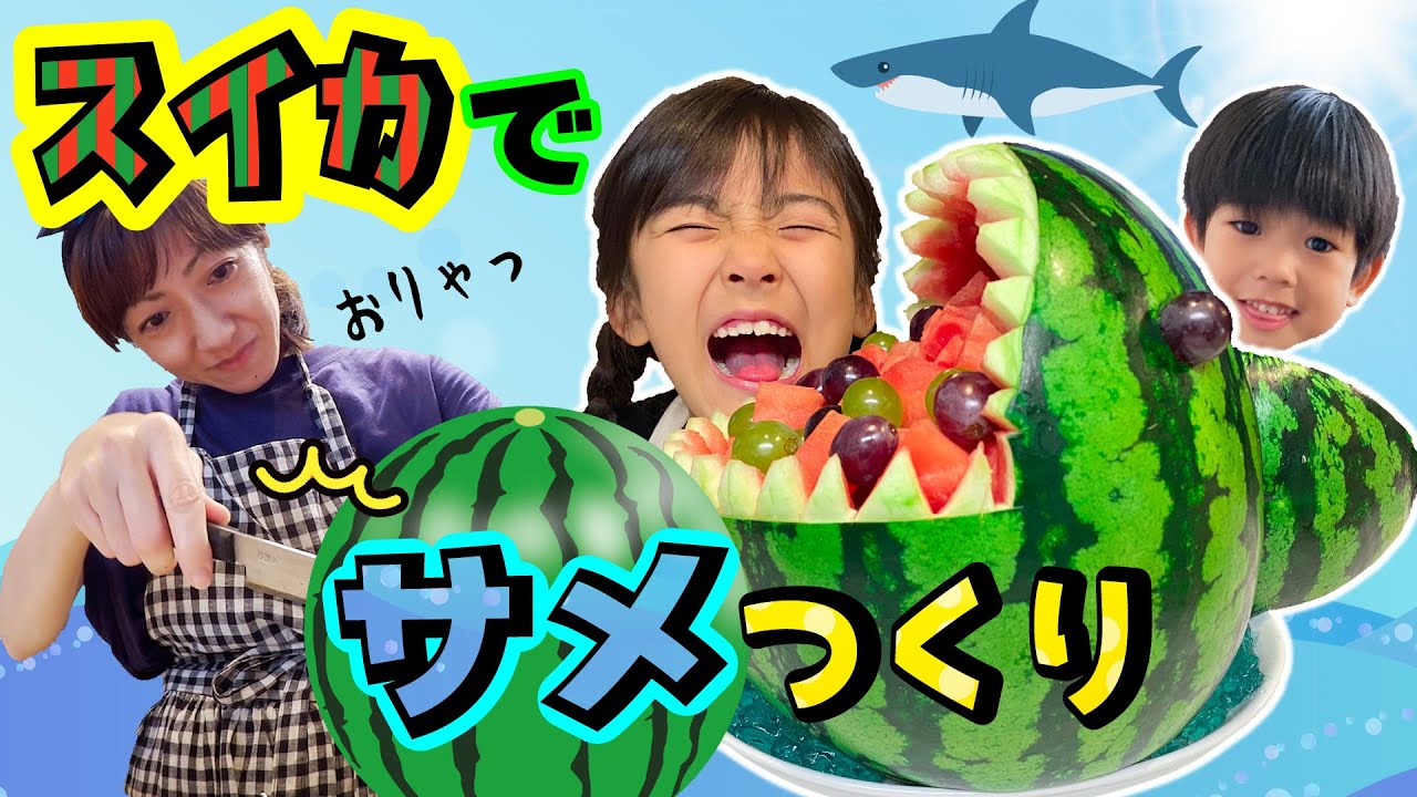 とってもりっぱなスイカだったので、ぎんのすきなサメをスイカで作ることに。