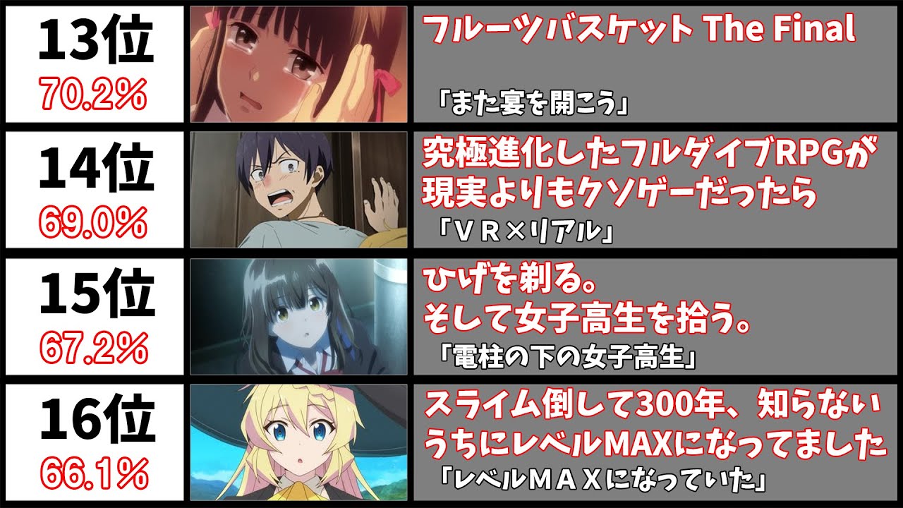 2021年春アニメ(2021年4~6月期)第1話のニコ生放送後アンケートでの最高評価率(アンケートの1の割合)ランキングをまとめました。1の割合が同率の場合は、2の割合で順位を決めています