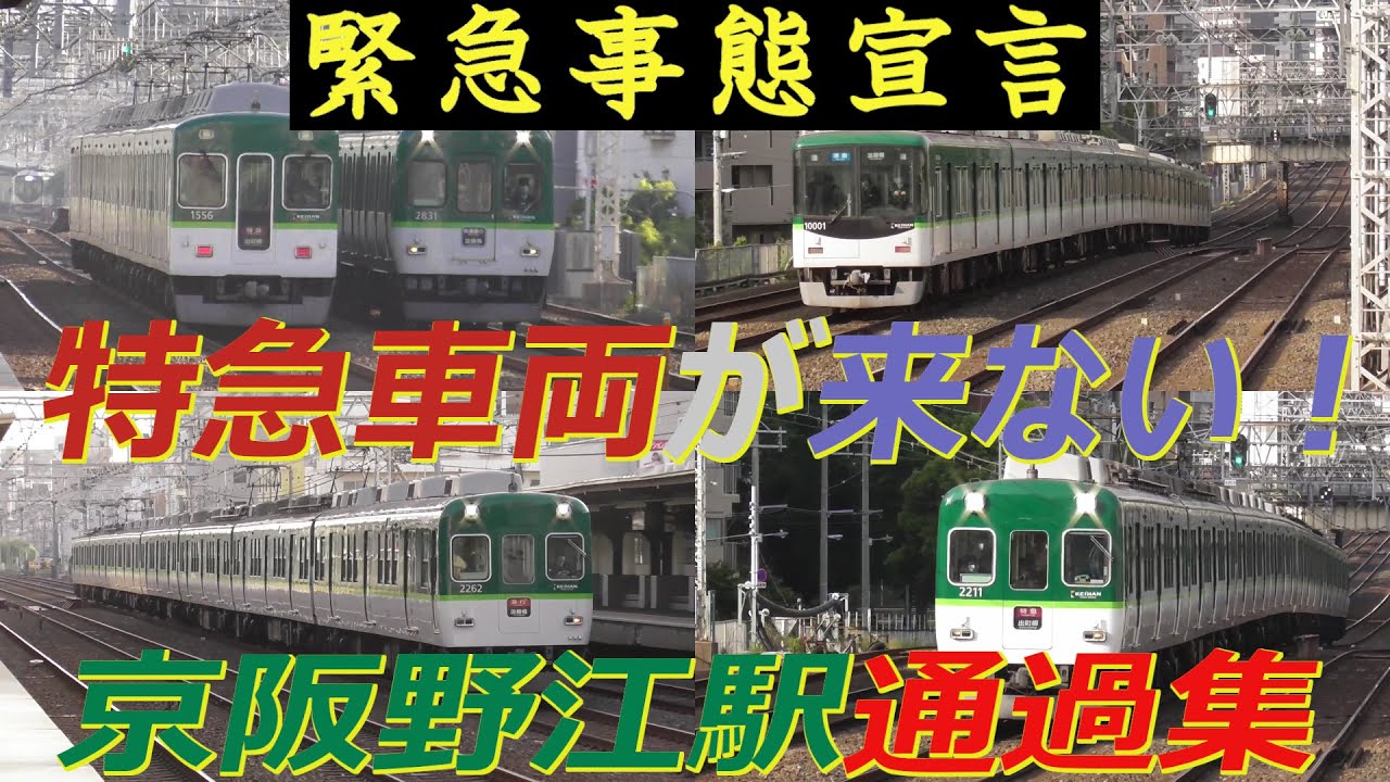 京阪本線の複々線区間にある野江駅で通過列車を収録。本来ならプレミアムカー連結の8000系と3000系の特急が通過していくが、撮影日は大阪府と京都府に緊急事態宣言発出中で、京阪線の土休日においてプレミアムカーサービスを中止するなどの特別ダイヤが組まれていたため、特急を含むすべての列車が一般車による運用となっていた。