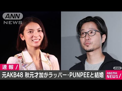 元AKB48のメンバーで女優の秋元才加さん(31)が結婚したことを発表しました。 お相手はラッパー歌手として活動するPUNPEEさん(36)。2人はおととし、週刊誌で熱愛が報じられ、その後も交際が伝えられていました。秋元さんは自身のツイッターを更新し、「おはようございます。この度、私、秋元才加は、6月20日に結婚致しました。今後も変わらず、精進して参ります。これからもどうぞよろしくお願い致します」とつづっています。 [テレ朝news] https://news.tv-asahi.co.jp ANNNEWSprovidedPUNPEETV ASAHItvasahiツイッターテレビ朝日テレ朝ニュースラッパー元AKB48発表秋元才加結婚