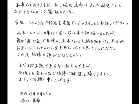 私事ではありますが、私、堀北真希は山本耕史さんと本日8月22日に入籍致しました。