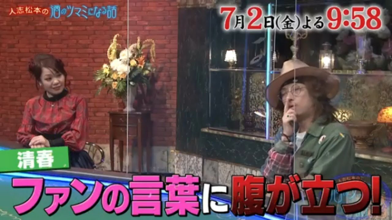 『人志松本の酒のツマミになる話』は“お酒の席が盛り上がれば何をしゃべってもOK”というルールの下、普段言えないような悩みや失敗談、心に秘めた本音を語り合うトークバラエティー。MCを務めるのは、松本人志とケンドーコバヤシ、陣内智則。ゲストには清春、津田篤宏(ダイアン)、ナヲ(マキシマム ザ ホルモン)、本仮屋ユイカが登場!円卓を囲み、番組特製の“酒瓶ルーレット”でトークの順番を決定する。それぞれの楽屋で事前にお酒を飲んできた一同だが「5年半ぶりにお酒を飲んだ」という本仮屋は、収録開始前から泥酔状態に。そんな本仮屋は「私0歳のときの記憶を持ってて…」と切り出す。彼女は母に連れられて行ったある場所の記憶が鮮明に残っていると語り「皆さんが持っている1番古い記憶はなんですか?」と問いかける。ケンコバや陣内が今でも忘れられない幼少期の出来事を語る中、清春が「僕が小学生くらいの頃、親父(おやじ)が僕の弟を…」と衝撃的なエピソードを話し始める。