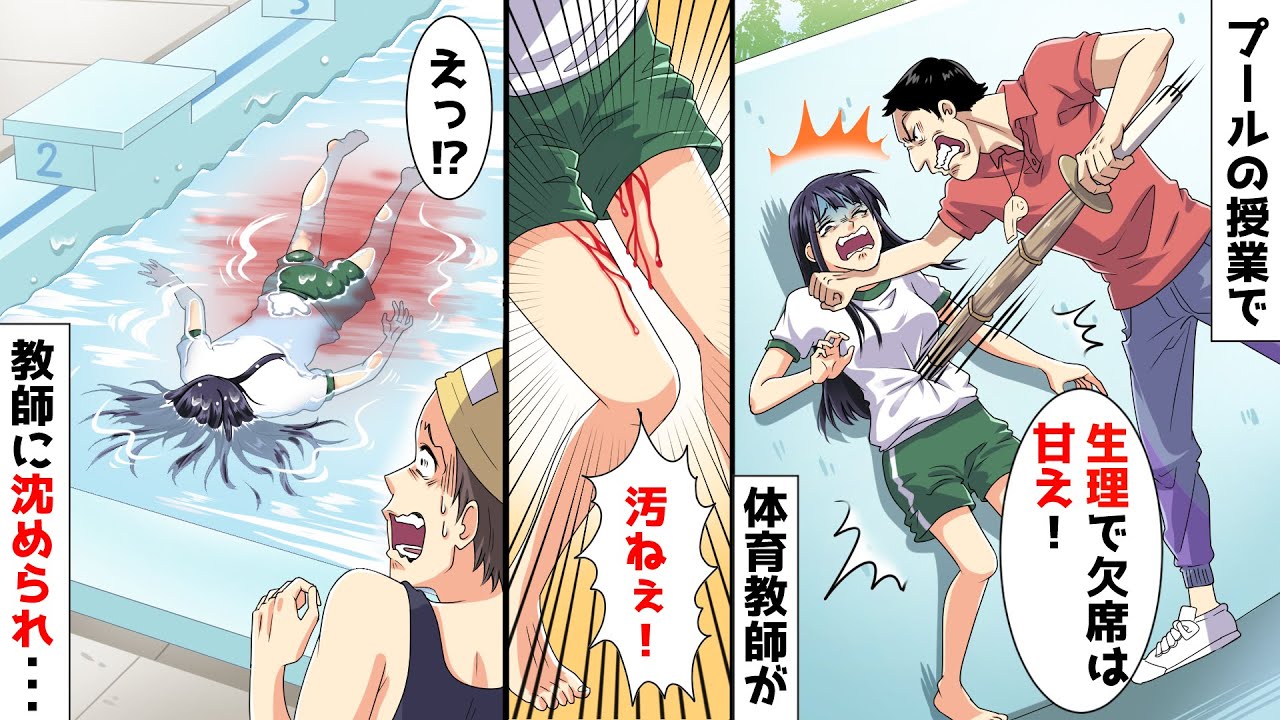 プールの授業を生理で見学すると、DQN教師に「嘘ついてサボるな!生理は甘え!」とプールに落とされ…