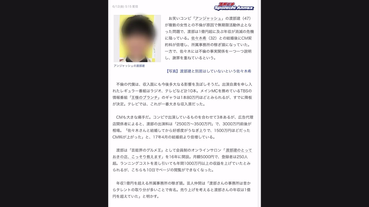 Share Facebook Twitter Pinterest LinkedIn ※途中雑音が入っております。ご注意ください。 元記事はこちら:https://www.sponichi.co.jp/entertainment/news/2020/06/12/kiji/20200612s00041000026000c.html 【アンジャ渡部、年収1億円超“消滅危機”…佐々木希と結婚後CM契約料倍増、痛すぎる不倫の代償】という記事を読んで #渡部建 #佐々木希 #アンジャッシュ アンジャッシュ佐々木希渡部建