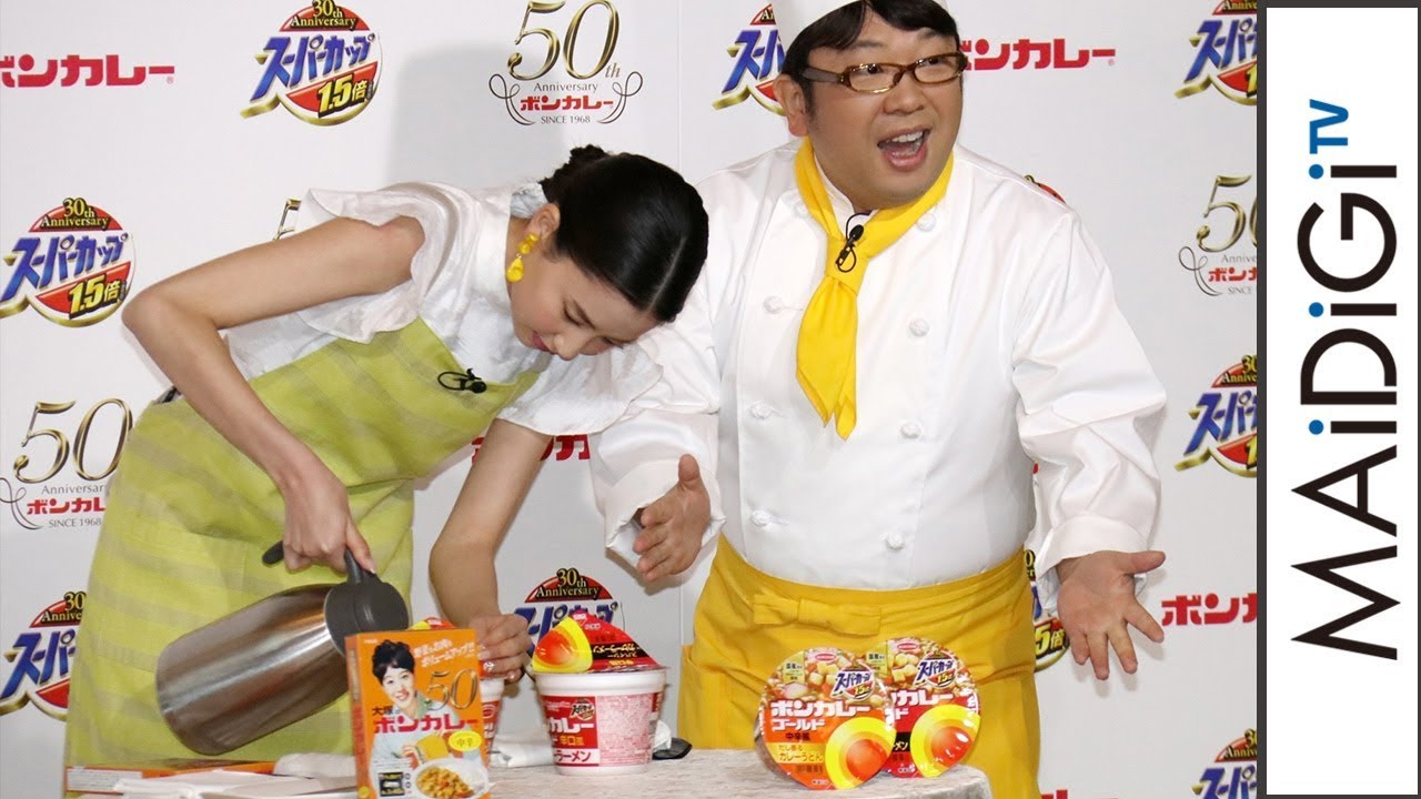 モデルで女優の河北麻友子さんとお笑いコンビ「キャイ~ン」の天野ひろゆきさんが1月22日、東京都内で行われたボンカレーの50周年記念イベントに出席。イベントでは、発売から50周年を迎えるレトルトカレー「ボンカレー」の歴史を振り返りながら、50周年記念の新商品と、同じく発売から30周年を迎えるエースコックのカップラーメン「スーパーカップ」とのコラボ商品が発表されたほか、天野さんと河北さんがコラボ商品の調理実演と試食を行った。