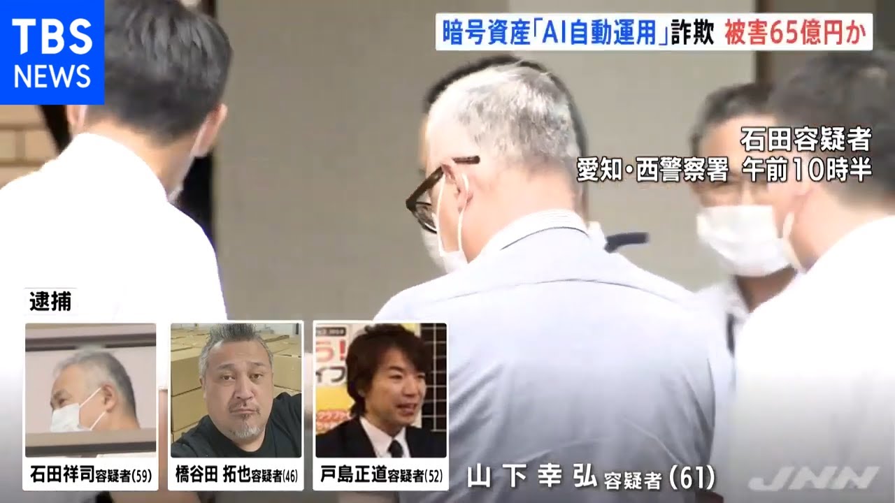 詐欺の疑いで愛知県警に逮捕されたのは、石田祥司容疑者、橋谷田拓也容疑者、山下幸弘容疑者、戸島正道容疑者の4人です。捜査関係者によりますと、4人は投資グループ「オズプロジェクト」の中心人物で、人工知能を使って暗号資産を自動的に運用すれば、「4か月で2.5倍になる」などともちかけ、出資者から現金をだまし取った詐欺の疑いがもたれています。