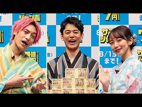 妻夫木聡と吉岡里帆、お笑いコンビ・EXITの兼近大樹が、「サマージャンボ宝くじ」「サマージャンボミニ」発売記念イベントに出席した。3人は色とりどりの浴衣姿で登場。新CMにゲスト出演している兼近は、撮影時を振り返り「ウルトラの5兄弟と共演したみたいな、そんなテンションになりました」とコメントした。「5年ぐらい前からツイッターとかで『吉岡里帆が大好きだ!』と書いている」という兼近。本人を横に「たまんないっすね!」と笑顔を見せつつ、「他の吉岡里帆ファンを思い、目には入れないようにしています。公平にするために」と話していた。
