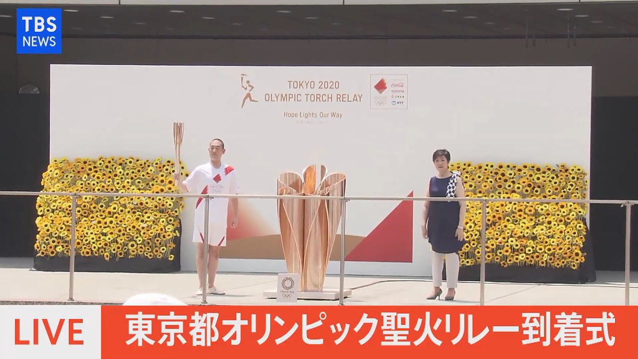 開会式で灯される聖火の到着式が行われる東京都庁前、都内最終地点のこの場所ではこのあと、新宿区内を走る予定だったランナー40人がトーチキスを行います。