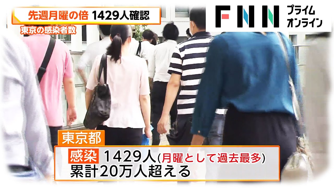 東京都で新たに感染が確認されたのは、1,429人で、先週の月曜日の727人から702人増えて、7日連続で1,000人を超えている。