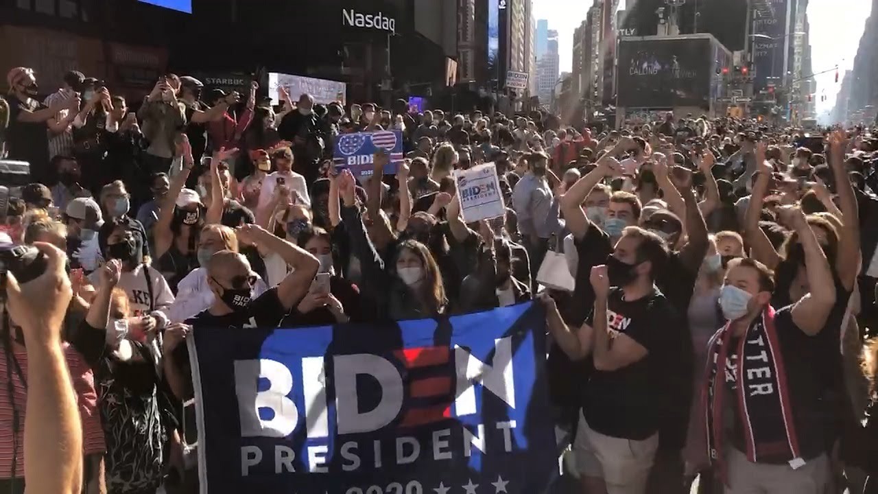 共和党のドナルド・トランプ米大統領(74)と民主党のジョー・バイデン前副大統領(77)が争うアメリカ大統領選。バイデン氏当選の報が伝わると、ニューヨーク中心部では沿道で飛び上がったり、手を振ったりして喜ぶ人たちの姿が見られた。車からクラクションを鳴らす人たちもいた。観光名所のタイムズスクエアには直後から大勢の人が集まった。歌を歌い、踊って喜びを爆発させる若い女性らの姿もあり、お祭り騒ぎに。 ASAHINEWSアメリカ大統領選挙ニュース朝日新聞速報