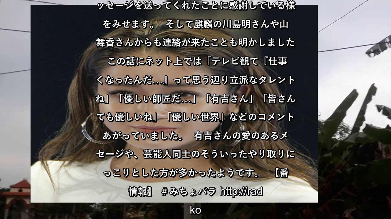 ✍ “みちょぱ”こと池田美優さんがパーソナリティをつとめる毎週日曜23時から放送のラジオ番組『#みちょパラ』(ニッポン放送ほか)。10月25日の放送では、池田さんが自宅待機期間中のことを明かす場面がありました。 (画像:時事通信フォト) ■みちょぱ「復活しました」と報告。自宅待機期間中の過ごし方は…? 新型コロナウイルス感染者との濃厚接触が確認されたため、自身はRCR検査の結果は陰性だったものの、自宅待機となっていた池田さん。 番組冒頭、「復活しました」と報告。そして、自宅待機期間中の過ごし方の話へ。 池田さんは、自宅待機中毎日体温を計測。結果、熱が出ることは無く、味覚などにも問題も無く、体調は良好だったそうで「毎日、1日12時間くらいは寝て…」と、とにかく寝ていたことを告白。 また、ゲームをしたり、たまに半身浴をしたりと、のんびり過ごしたようで「もうなんかね、怠け者の生活を毎日送ってて、テレビを観て『あぁ~やべ。仕事全部とんだんだった』って思いながら…」と言って、自宅待機の2週間全ての仕事が白紙になってしまったことへの焦りを、テレビを観ながら感じることがあったことも明かします。 とはいえ「もともと結構やっぱインドア派の人間だから、申し訳ないけど、わりと優雅に生活していましたね。あたし。全然苦じゃない」と振り返りました。 ■自宅待機中、有吉から届いたメッセージに「優しいですね。優男でした」みちょぱ、復活報告に「優しい世界」の声 その後、池田さんが「意外と芸能人の方とかね、なんか色んな人から連絡くれて」と切り出し、自宅待機中に芸能人から貰ったメッセージの話へ。 貰った人物に、フワちゃん、鷲見玲奈アナウンサーの名前をあげる中「あと一応ね、師匠からも来ましたね」と池田さんが師匠と呼ぶ有吉弘行さんからもメッセージが来たこと、また「優しいね。優しいけど、やっぱちょっと照れ隠しがあるよね」と言って、その内容を明かします。 なんでも、池田さんは出演予定だった生配信イベント「シュウ ウエムラ×ワンピース コレクション」が延期になってしまったことを告げるツイートをTwitterでしたそう。すると有吉さんから連絡が来たのだとか。 「師匠からは『シュウ ウエムラの代役行けます』っていう連絡だけ来て…」と笑いながら明かし「行けるかぁ!っていう。コスメブランドだっ …