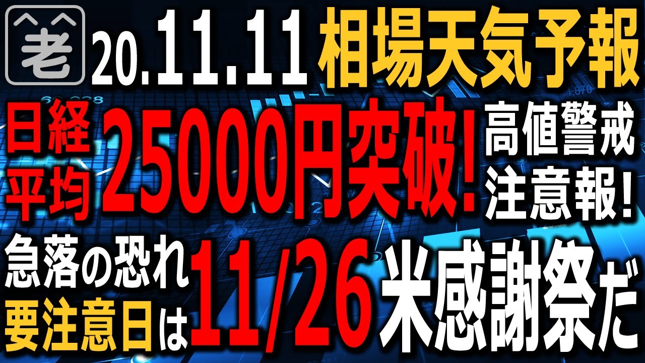 タイミング的には、11/26のアメリカ感謝祭付近に、調整や急落がありえるので、注意が必要です。