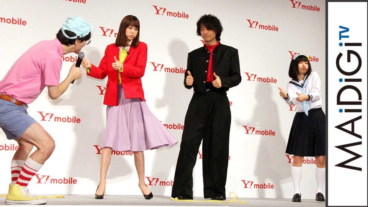 お笑いコンビ「にゃんこスター」がワイモバイルのテレビCMに起用され、11月30日、東京都内で開かれたワイモバイルの新商品・新サービス発表会に桐谷美玲さんと斎藤工さんとともに登場した。