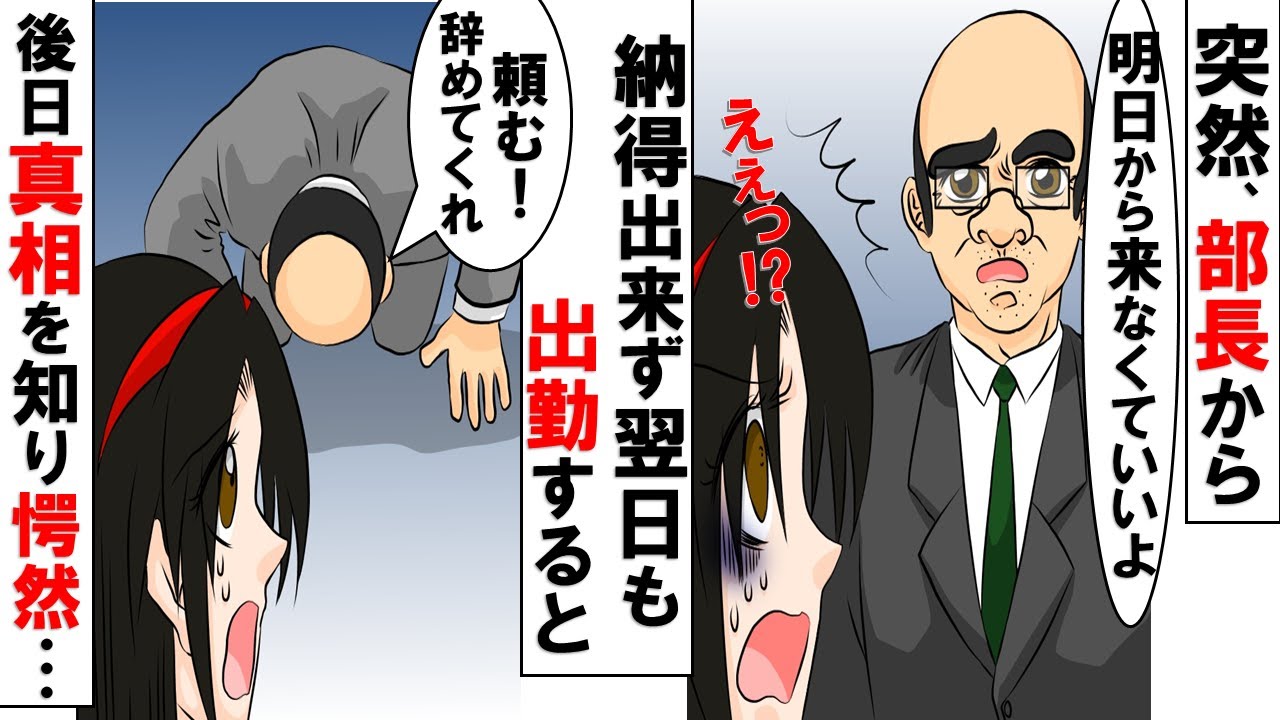 主人公はユミ。ユミは2年目のまだまだ新人社員。毎日楽しく仕事をしていた。しかし、ある日突然部長に呼び出され「明日から来なくていいから」と宣告。何かミスをしたわけでもなく「どうしてですか」と問いただしても一切理由を教えてくれな。訳がわからず普通に次の日も出勤すると部長が土下座で「頼むからやめてくれ」と土下座をしてきた。