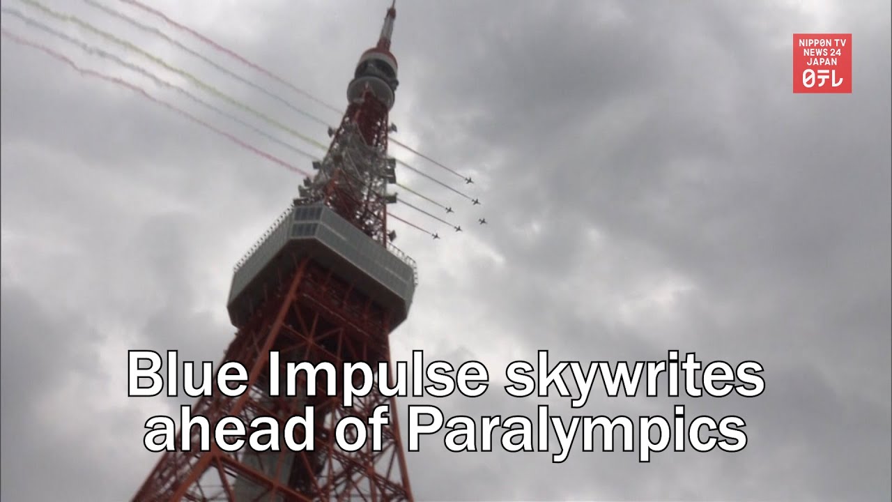 The Japanese Air Self-Defense Force’s Blue Impulse skywrites ahead of the opening ceremony of the Tokyo Paralympics.