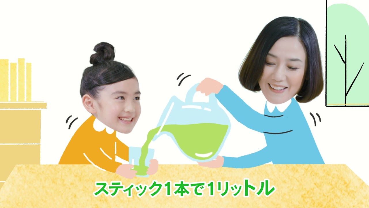 水にさっと溶かして緑茶を作ると、「スティック1本で1リットル」と言いながら少女に緑茶を注いであげます。ちょっと注ぎ過ぎてしまい、「おっとっと…!」と盛り上がる二人。