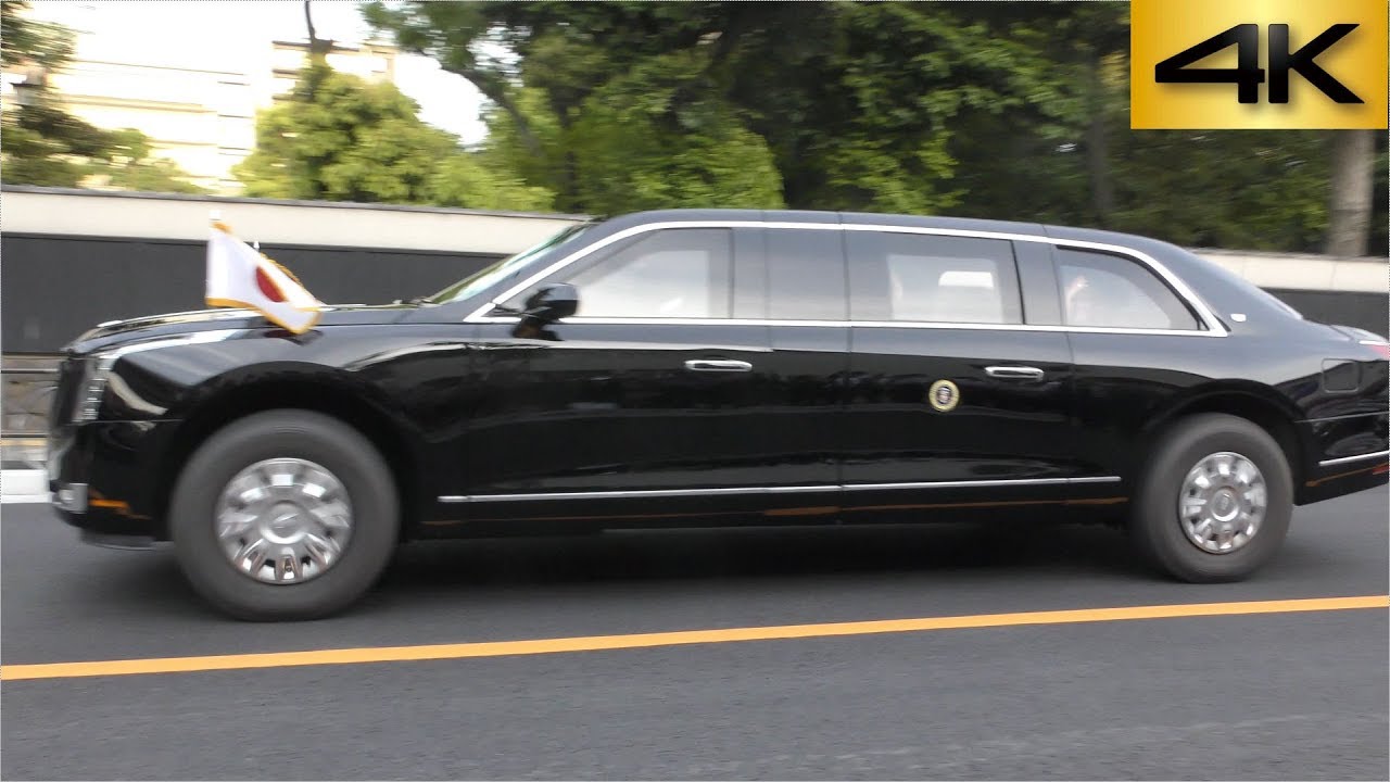 2019.5.26 国技館から出てきたトランプ大統領一行 国旗を掲げた2台の車が大統領専用車で2台目に大統領夫妻が乗ってます その後ろ2台の日本側警備車とシークレットサービスが乗った1台のサバーバンの次、ルーフに2つアンテナを付けた車が通る時、音声にノイズが入ります この車は電波妨害をおこないIED等に対応する車両だそうです トランプ大統領夫妻