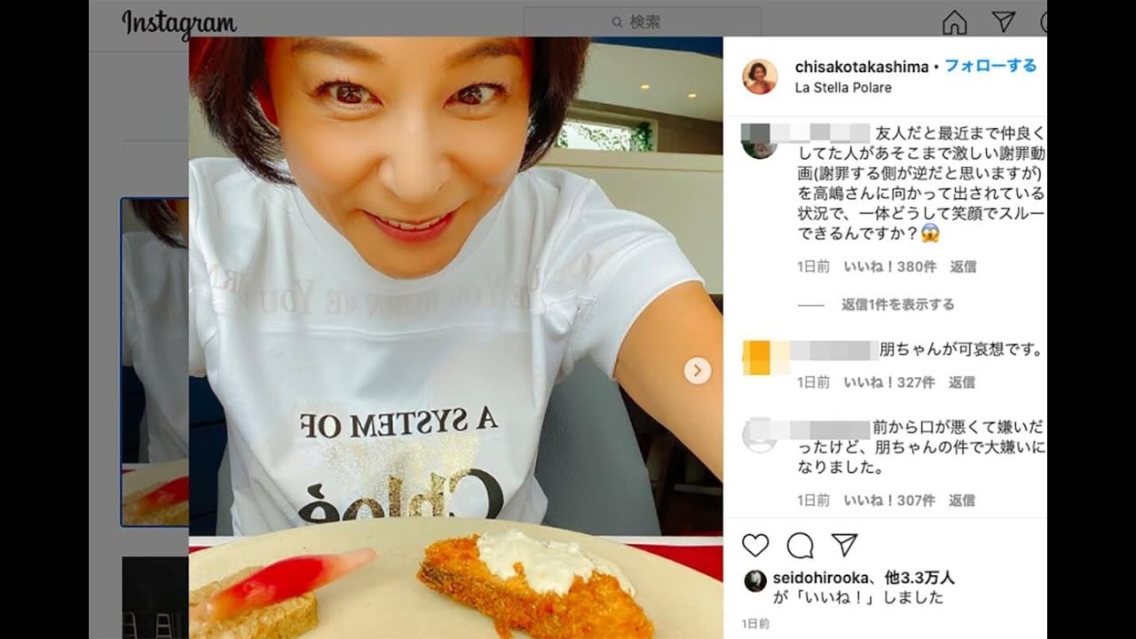謝罪動画のコメント欄に「が謝罪しろ」「圧力かける高嶋側が悪いでしょ?」「はなぜ出てこないの?」といった声が寄せられているだけでなく、高嶋のインスタグラムやツイッターにも、批判的なコメントが大量に投下された。