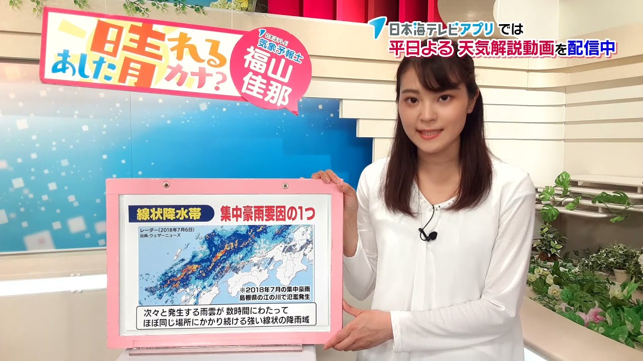 日本海テレビアプリでは平日夜に気象予報士による天気解説動画を配信中。その中から特に皆様に知ってほしい情報をピックアップし再配信します。 アプリ動画では山陰の天気情報とともに翌日の過ごし方のポイントや注意点をお知らせしていますので、ぜひご活用ください! 日本の天気予報日本海テレビ気象予報士福山佳那線状降水帯