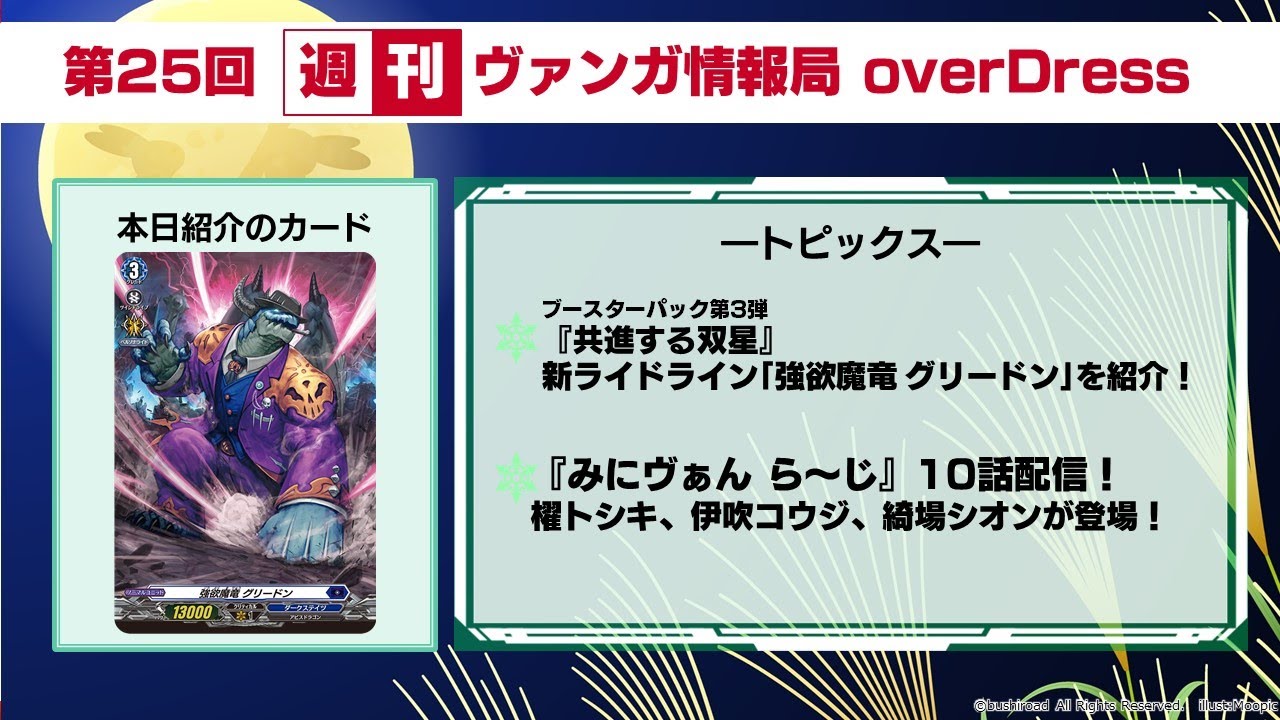 毎週火曜21時より、週刊ヴァンガ情報局 overDressをお送りします!■出演■ MC:#真野拓実 ■番組内容 「週刊ヴァンガ情報局 overDress」とは? アニメに関するお話や、最新カード情報、イベント情報など、「カードファイト!! ヴァンガード」のあらゆる最新情報をお届けする番組! ひと足早く、ヴァンガードの最新情報をゲットしよう! ヴァンガードファイター必見の番組です!#ヴァンガード #VGD #生配信 #TCG overdressTCGVanguardVGVGDアニメヴァンガヴァンガードオーバードレスカードゲームカードファイト!! ヴァンガード overDressブシロードホビー