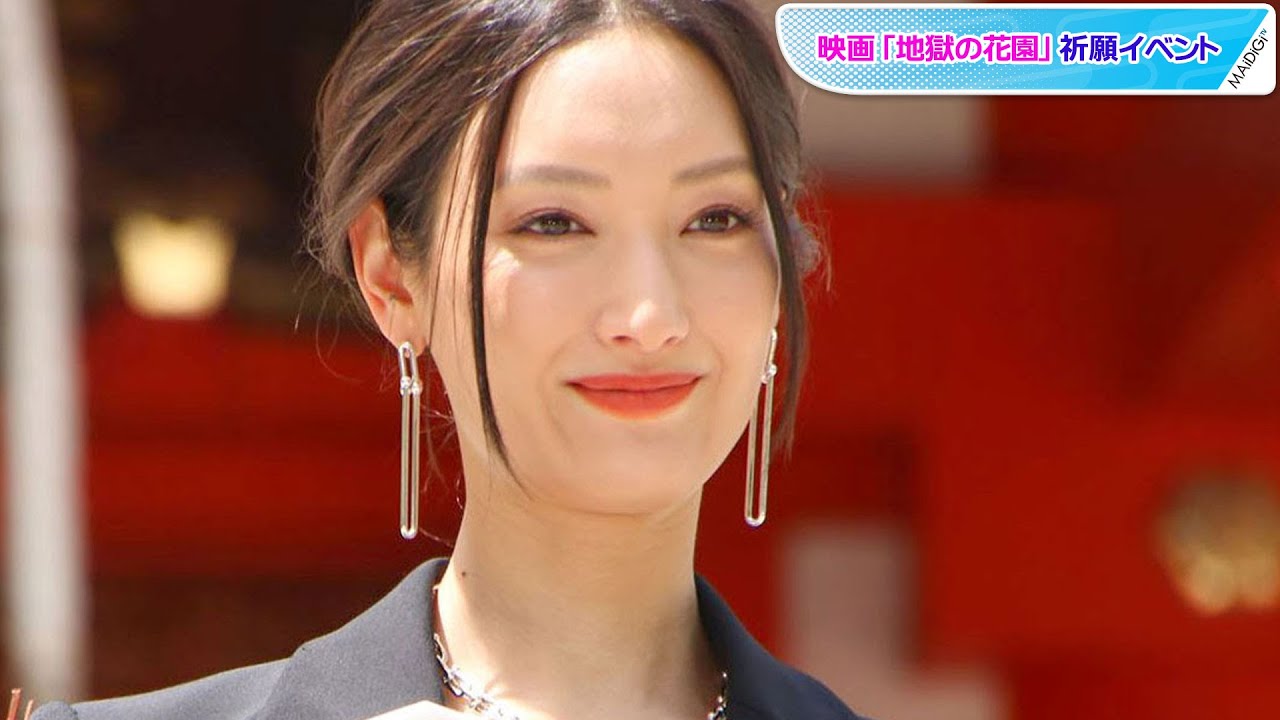 女優の菜々緒さんが5月4日、東京・新宿の花園神社で行われた永野芽郁さんの主演映画「地獄の花園」(関和亮監督、5月21日公開)の祈願イベントに登場した。黒いジャケットに黒いスリムなパンツを合わせた、脚線美が際立つ装い。ジャケットの袖をまくり、シルバーカラーのサンダルやアクセサリー、まとめ髪と赤いリップでスタイリッシュに着こなしていた。