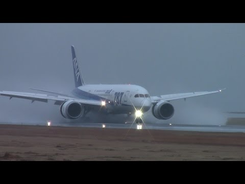 雨の滑走路でのボーイング787ランディング。逆噴射がカッコいいです。